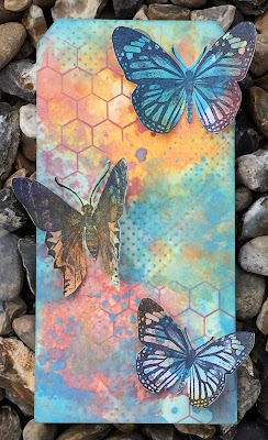 I do do a lot of bits and bobs, but what with running the shop most days, time often runs away with me. I created 3 variations on a theme for our Creative Team challenge, and used my Gel plate to create backgrounds, plus a stencil from PaperArtsy's artist Sara Naumann. I also used our own mini stencils, and calligraphic mat. Colour blue, as always lol